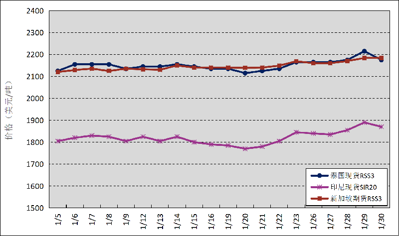 國(guó)外主產(chǎn)區(qū):1月,國(guó)外主產(chǎn)區(qū)價(jià)格整體小幅上揚(yáng)。其中,泰國(guó)3號(hào)煙片膠(RSS3)平均價(jià)格2151美元/噸,環(huán)比增加80美元/噸,最高價(jià)2215美元/噸,最低價(jià)2115美元/噸;印尼20號(hào)標(biāo)準(zhǔn)膠(SIR20)平均價(jià)格1820美元/噸,環(huán)比增加100美元/噸,最高價(jià)1890美元/噸,最低價(jià)1770美元/噸。