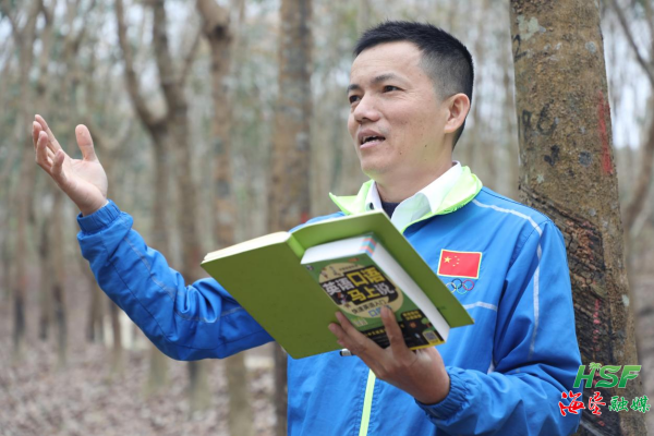清晨的膠林,陽光透過參差的橡膠葉,灑落在全國割膠狀元虞海濃的身上。他手捧著英語書,邊讀邊記,不時(shí)在筆記本上記錄不熟悉的單詞。作為海南橡膠加釵分公司生產(chǎn)技術(shù)部部長,常年與割膠打交道的他,瘋狂學(xué)英語卻成了他最近的常態(tài)。