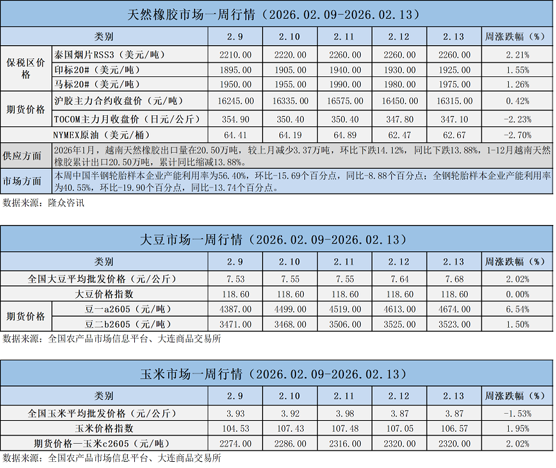 天然橡膠、大豆、玉米市場一周行情(2026.02.09-02.13)