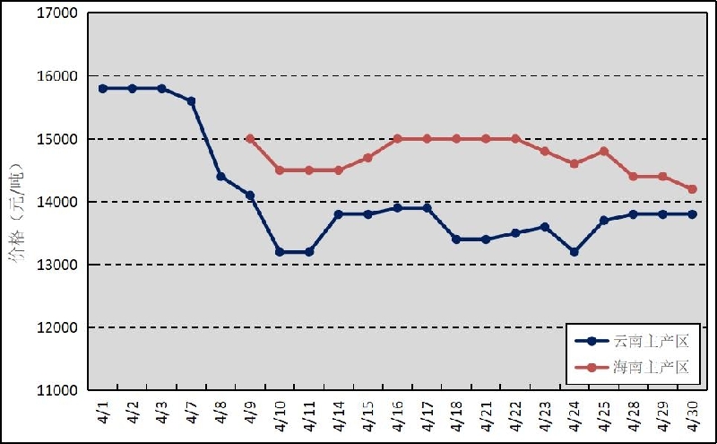 國(guó)內(nèi)主產(chǎn)區(qū):4月,國(guó)內(nèi)云南產(chǎn)區(qū)全面開(kāi)割,海南產(chǎn)區(qū)和廣東產(chǎn)區(qū)月底開(kāi)割。云南、海南鮮膠乳(折干膠)月均價(jià)格分別為14071元/噸、14713元/噸。
