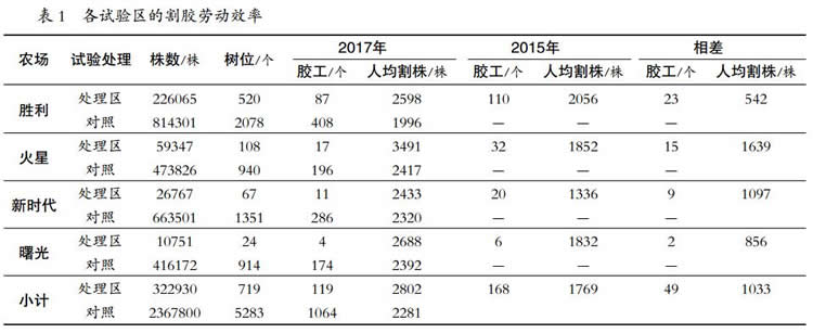 處理區(qū)人均承割 6 個樹位,比對照區(qū)人均承割樹位多 1 個;處理區(qū)人均割株 2802 株,比對照區(qū)平均多 521 株,增幅為 22.84%。處理區(qū)內(nèi) 2017 年膠工比 2015 年(s/2d4+ET 割制)減少 49 人,減幅為 29.17%;處理區(qū)內(nèi) 2017 年人均割株比 2015年(s/2d4+ET割制)多 1033 株,增幅為 58.40%(表 1)。
