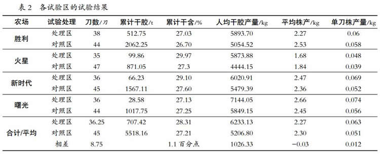 處理區(qū)平均株產(chǎn)干膠 2.27 kg,比對照低 0.03 kg/株,減幅 1.30%;處理區(qū)平均單刀產(chǎn)干膠 0.063 kg/(株·刀),比對照高 0.012 kg/(株·刀),增幅 23.53%(表 2)。