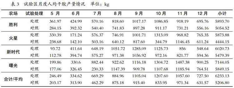 收集每刀數(shù)據(jù),規(guī)范數(shù)據(jù)收集的表格。收集的數(shù)據(jù)包括開割時間、刀次、膠水產(chǎn)量、干膠產(chǎn)量、干含、人均產(chǎn)量及涂藥濃度等,每一個月匯總一次數(shù)據(jù),并及時跟蹤試驗基地的情況。收集膠工報酬標準與收入數(shù)據(jù), 以全場為對照區(qū),對產(chǎn)膠數(shù)據(jù)進行
