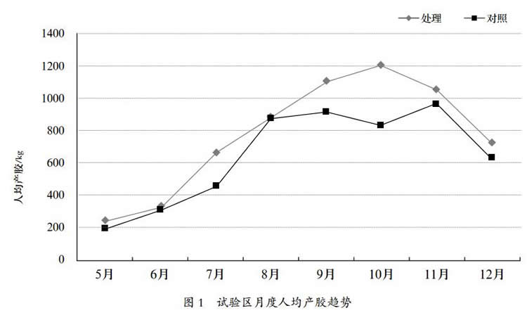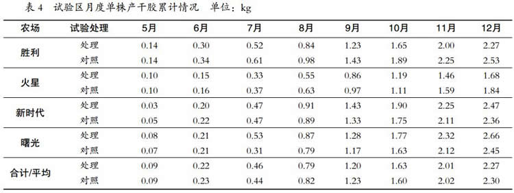 5—12 月處理區(qū)與對照的單株干膠產(chǎn)量累計都相差不大;6 月、7 月單株干膠產(chǎn)量累計分別比上月增加幅度均較小,8 月、9 月、10 月和11 月單株干膠產(chǎn)量累計分別比上月增加幅度均較大,12 月單株干膠產(chǎn)量累計比上月增加幅度較小(表 4)。