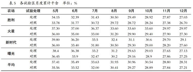 處理區(qū)年平均干含 28.31%,比對照高 1.1 百分點。火星、新時代、曙光和勝利 4 個處理區(qū)的干含依次分別為 29.97%、29.1%、27.13%和 27.03%,分別比各自對照高 2.67、1.5、-0.12、0.33 百分點(表 2)。