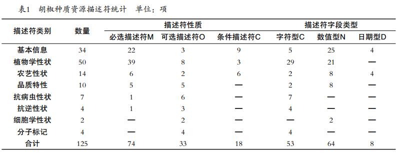 基本信息數(shù)據(jù)對于種質(zhì)資源研究和共享利用至關(guān)重要。按照植物種質(zhì)資源共性描述規(guī)范的原則要求,統(tǒng)一種質(zhì)資源共性信息,統(tǒng)一描述項目。胡椒種質(zhì)資源規(guī)定了34項基本信息描述符,主要包括種質(zhì)圃編號、采集號、引種號、種質(zhì)名稱、科名、屬名、學(xué)名、種質(zhì)類型、主要特性、主要用途、系譜、育種手段、繁殖方式、采集地、保存單位、圖像和鑒定評價機構(gòu)等,涉及征集、保存、主要特征、用途及共享等多方面內(nèi)容。由于胡椒種質(zhì)資源在國內(nèi)外均有分布,且野生近緣種資源占有較大比例,因此條件描述符5項,主要涉及采集地位置信息以及引種號和引種外文名,其余29項為必選描述符,均是具有共性的種質(zhì)基本特征及主要特征等(表1)。