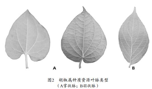 胡椒種質(zhì)資源葉脈類型、葉脈數(shù)量等組成的脈序結(jié)構(gòu)在不同種間的差異較大,可以作為鑒定物種的重要依據(jù)[14]。根據(jù)相關(guān)資料及調(diào)查研究,確定了葉脈類型有掌狀脈和羽狀脈2種(圖2),葉脈數(shù)量分為3個類別。胡椒屬花器官嚴(yán)重退化,無花被,僅剩雌蕊、雄蕊以及葉片變態(tài)形成的苞片,苞片形狀是胡椒屬物種分類鑒定的一個重要性狀。產(chǎn)自拉丁美洲的P. dilitatum等種質(zhì)的苞片為三角形,胡椒(P. nigrum)等苞片為長圓形,屏邊胡椒(P. pingbianense)等苞片為倒卵形,海南蒟(P. hainanense)等苞片為倒卵狀長圓形,產(chǎn)自廣東的瀕危物種中華胡椒(P.chinense)的苞片為圓形,因此共確定了5個苞片形狀類型。